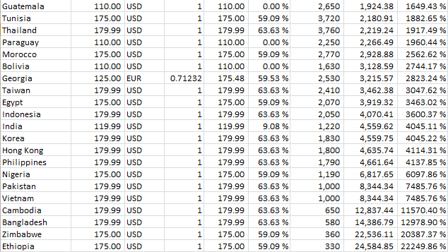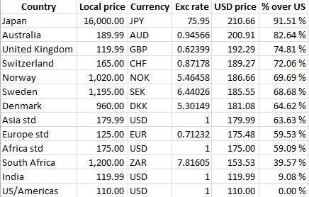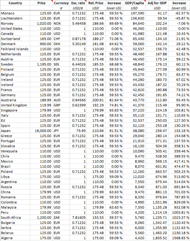 (had to break this up for screen size, apologies if your country is missing…) As is eminently visible, the price I pay in Norway, adjusted for GDP, is actually less than in the USA. Consequently, I should be a happy camper. Think I will still do the US subscription. Or get it via the library.